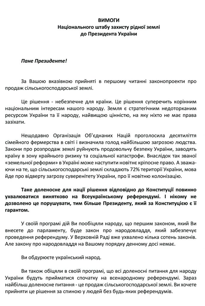 Національний штаб затвердив вимоги до президента Володимира Зеленського, у яких йдеться про необхідність відкласти ухвалення «земельних законів», продовжити мораторій та оголосити референдум – давши народу самостійно вирішити, продавати сільськогосподарську землю чи ні.