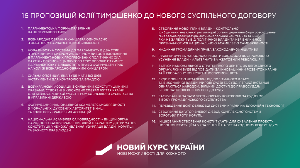 «Запропоновані мною 16 пропозицій до нового суспільного договору усунуть корупцію, безлад, двовладдя та інші вади в чинній Конституції. Як відомо, саме вади нинішнього Основного закону призвели до того, що країна розбалансована, економічно слабка і ми зараз маємо низький рівень життя людей», – наголосила політик.