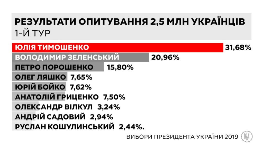 У результаті були отримані наступні дані: перше місце – Юлія Тимошенко (31,68%), друге – Володимир Зеленський (20,96%), третє – Петро Порошенко (15,80%).