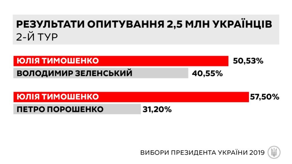 У другому турі Юлія Тимошенко виграє у Володимира Зеленського – 50,53% проти 40,55% відповідно, а також у Петра Порошенка – 57,50% проти 31,20%.