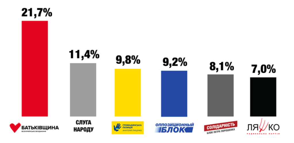 Лідером рейтингу підтримки серед партій є «Батьківщина», за яку готові віддати свої голоси 22% опитаних, які вже визначилися із своїм вибором. За цим показником «Батьківщина», так само як і її лідер, в два рази випереджають інших учасників рейтингування. Якби вибори відбувалися найближчим часом, то в парламент потрапили б такі партії (окрім «Батьківщини»): «Слуга народу» – 11%, Громадянська позиція – 10%, Опозиційний блок – 9%, БПП «Солідарність» – 8%, Радикальна партія – 7%, партія «Наші» Є. Мураєва – 5%.